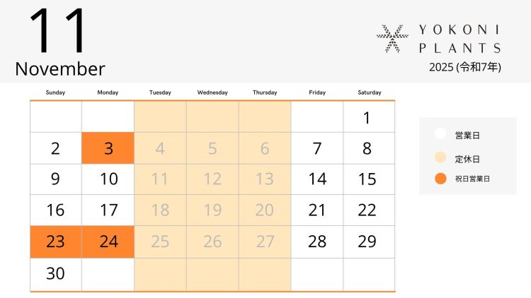 - 2025.10.29 - news 11月営業日 2025年11月の営業日カレンダーです。寒くなってくる季節ですが、まだまだ気持ちの良い日が続く11月。今月はアウトドアグリーンが大量入荷の予定です。オージープランツやレアな植物など面白い植物が届きますので、当店Instagramにて情報をお待ちください。