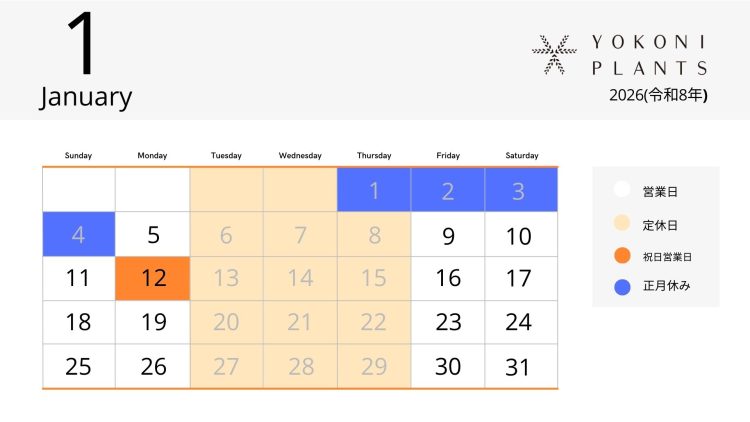 - 2025.12.26 - news 1月営業日 2026年1月の営業日カレンダーです。年始の営業は1月5日月曜日から再開いたします。2026年もありがたいことに沢山のご依頼がありますので、良い植物を集めさせて頂きます。今年も沢山の植物やお客様と出会えることを楽しみにしています。