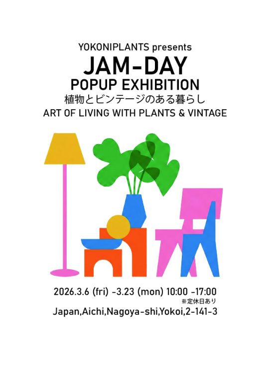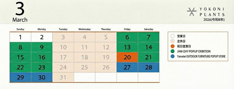 - 2026.02.28 - news 3月営業日 2026年3月の営業日カレンダーです。ようやく春を迎えます。植物の入荷が多いこの時期に、たくさんのイベントが開催されます。まずは、3月6日金曜日から23日月曜日まで、名古屋市南区のビンテージインテリアを扱うJAM-DAYさんのPOPUPを行います。当店でも人気なビンテージフラワーベースや、アメリカ・ヨーロッパの魅惑的なインテリアが並びます。観葉植物とビンテージインテリアの組み合わせをお楽しみ頂ければと思います。 続いて、3月27日金曜日から4月13日月曜日まで、いつもプランターでお世話になっているYAMATEIさんのOUTDOOR FURNITURE EVENTを行います。こちらはお